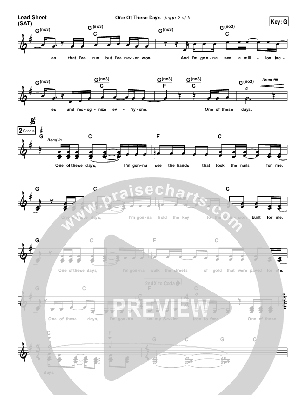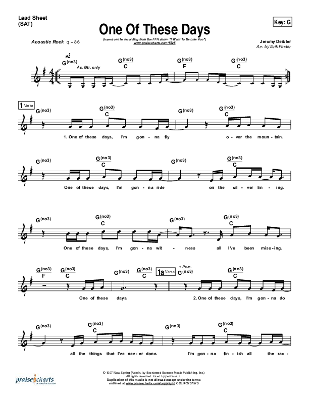 Download the sheet music for One Of These Days by FFH, from the album I Want To Be Like You. This song was arranged by Erik Foster in the key of A, G.