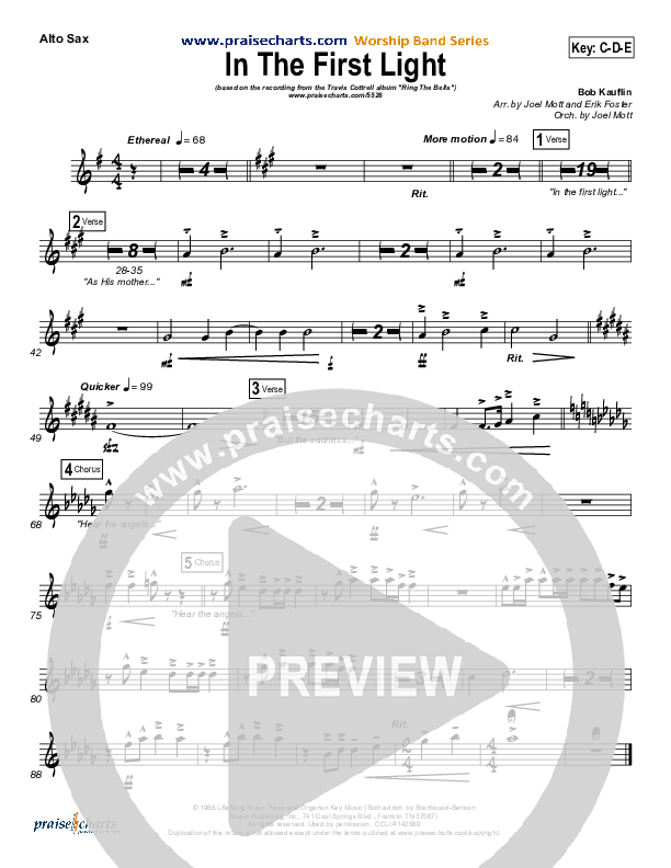 Download the AltoSax sheet music for In The First Light by Travis Cottrell, from the album Ring The Bells. This song was arranged by Joel Mott / Erik Foster in the key of C, Db.