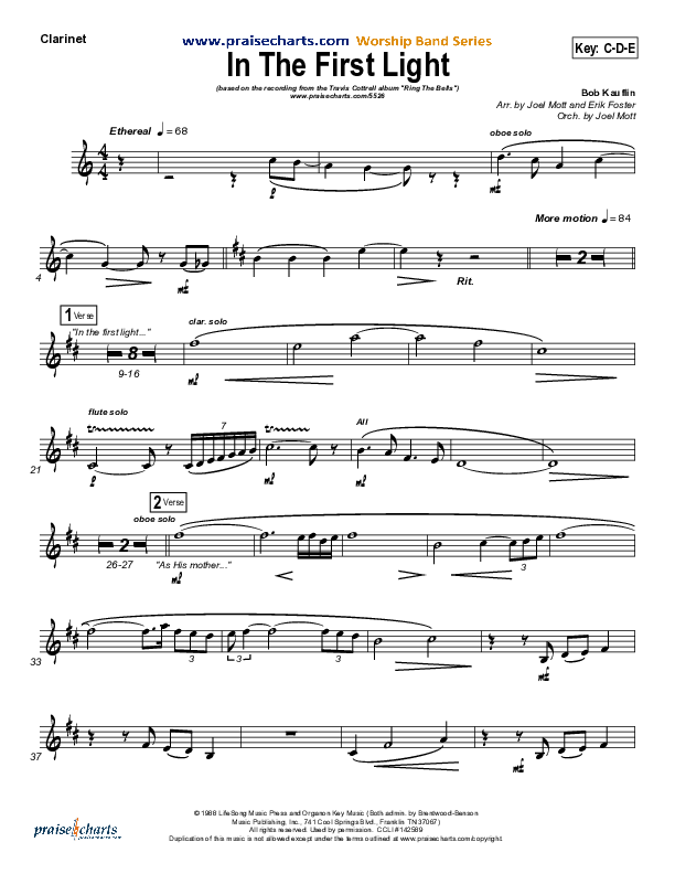 Download the Orchestration for In The First Light by Travis Cottrell, from the album Ring The Bells. This song was arranged by Joel Mott / Erik Foster in the key of C, Db.