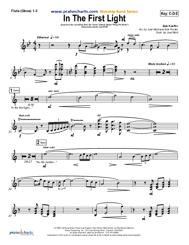 Download the Orchestration wind parts for In The First Light by Travis Cottrell, from the album Ring The Bells. This song was arranged by Joel Mott / Erik Foster in the key of C, Db.