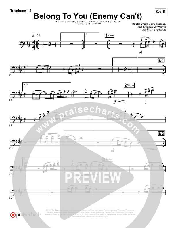 Download the Trombone 1,2 sheet music for Belong To You (Enemy Can't) by Iron Bell Music, from the album God That Saves. This song was arranged by Daniel Galbraith in the key of C, D.