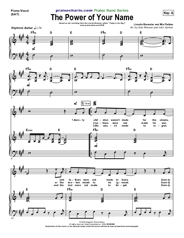Download the sheet music for The Power Of Your Name by Lincoln Brewster, from the album Today Is The Day. This song was arranged by John Wasson in the key of A, G.