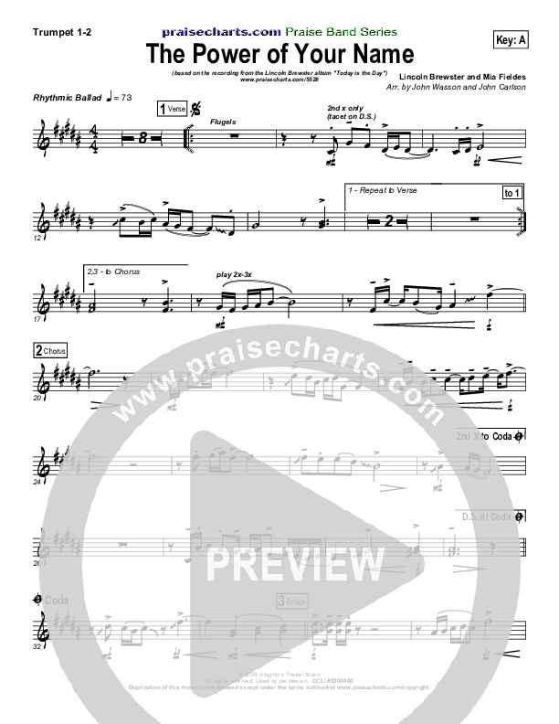 Download the trumpet sheet music for The Power Of Your Name by Lincoln Brewster, from the album Today Is The Day. This song was arranged by John Wasson in the key of A, G.