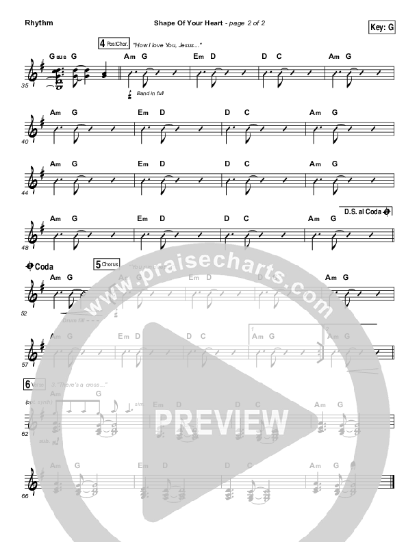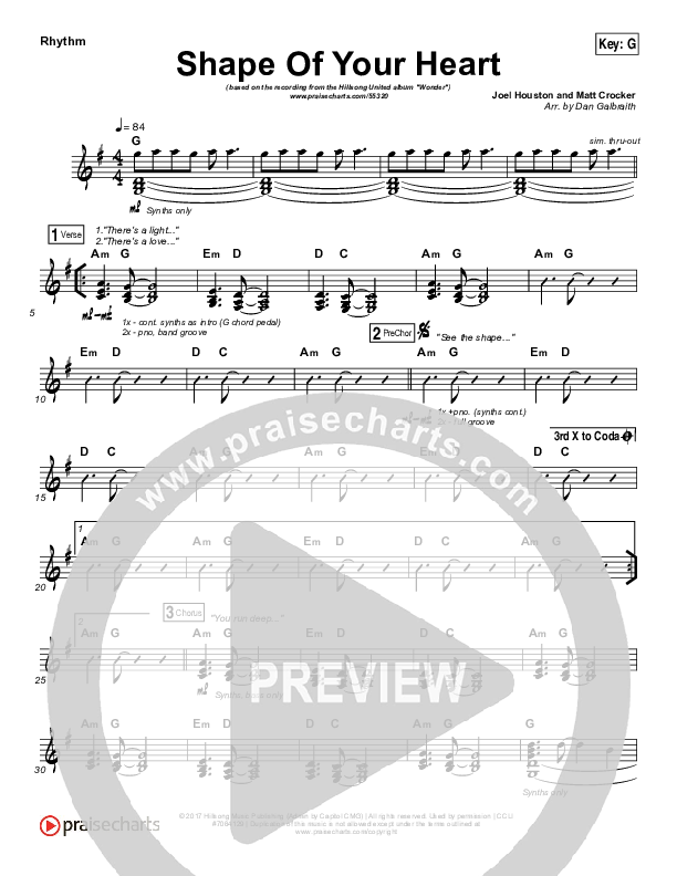 Download the Rhythm Chart for Shape Of Your Heart by Hillsong UNITED, from the album Wonder. This song was arranged by Daniel Galbraith in the key of Ab, G.