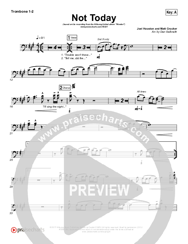 Download the Trombone 1,2 sheet music for Not Today by Hillsong UNITED, from the album Wonder. This song was arranged by Daniel Galbraith in the key of A, Bb.