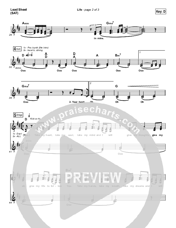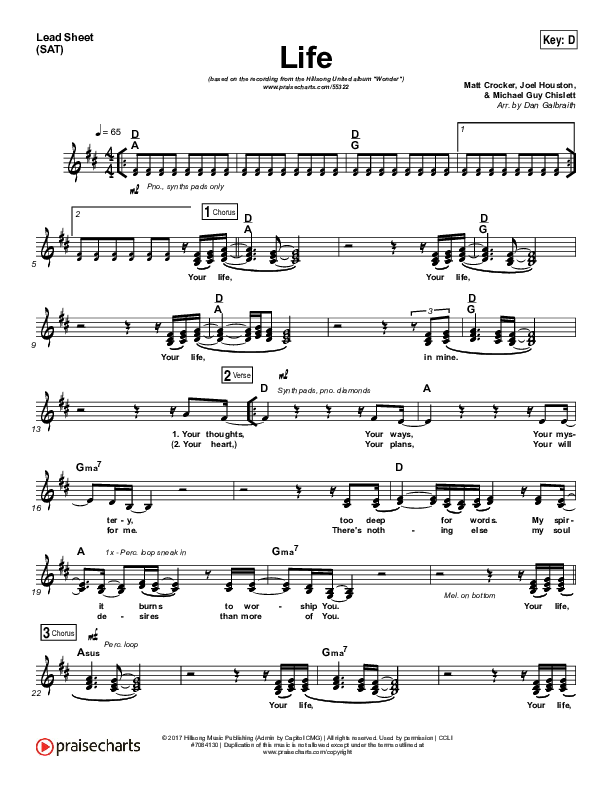 Download the sheet music for Life by Hillsong UNITED, from the album Wonder. This song was arranged by Daniel Galbraith in the key of D, Eb.
