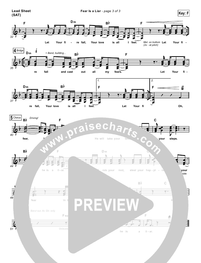 Download the sheet music for Fear Is A Liar by Zach Williams, from the album Chain Breaker. This song was arranged by Grant Wall / Daniel Galbraith in the key of E, F.