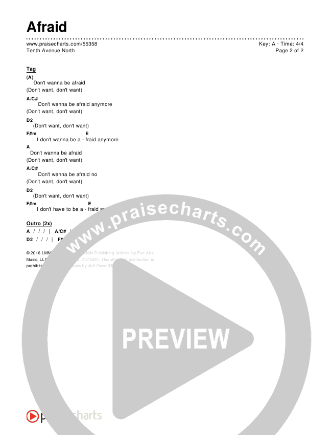 Download the PDF Chord Charts for Afraid by Tenth Avenue North, from the album Followers.