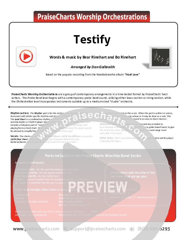 Download the Orchestration for Testify by Needtobreathe, from the album Hard Love. This song was arranged by Daniel Galbraith in the key of Bb, C.