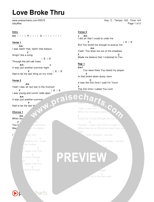 Download the PDF Chord Charts for Love Broke Thru by TobyMac, from the album This Is Not A Test. This song was arranged by Jared Haschek in the key of B, C.