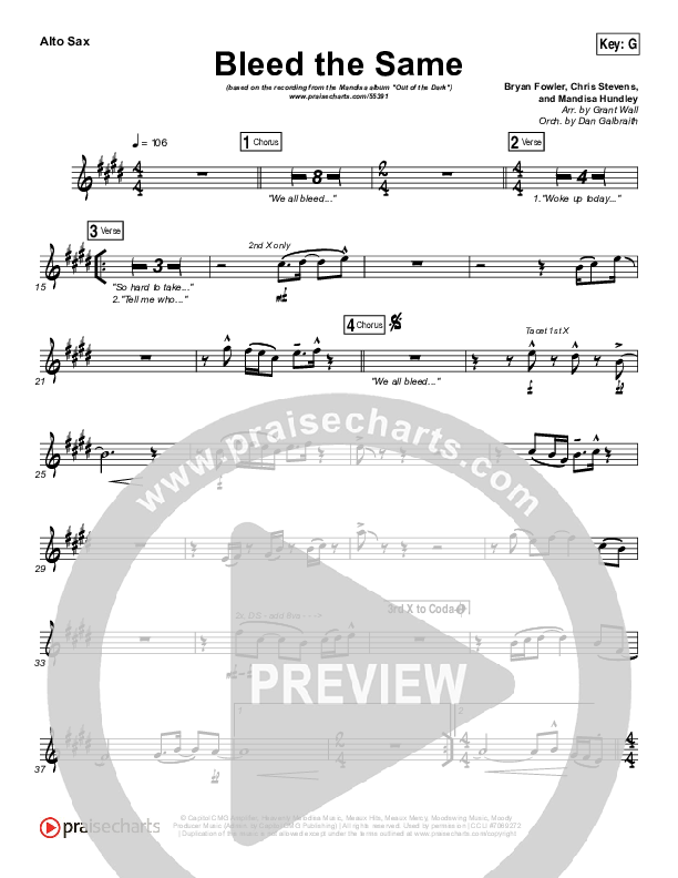 Download the AltoSax sheet music for Bleed The Same by Mandisa, from the album Out Of The Dark. This song was arranged by Grant Wall / Daniel Galbraith in the key of F, G.