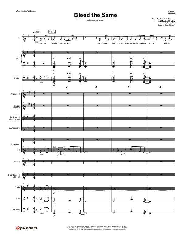 Download the Orchestration for Bleed The Same by Mandisa, from the album Out Of The Dark. This song was arranged by Grant Wall / Daniel Galbraith in the key of F, G.