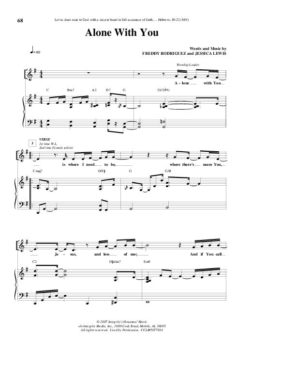 Download the sheet music for Alone With You by Freddy Rodriguez, from the album Light In The Darkness. This song was arranged by Integrity Music in the key of G.