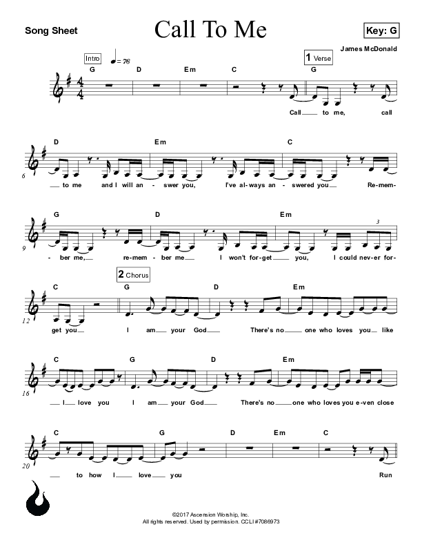 Download the sheet music for Call To Me by Ascension Worship, from the album Songs Of Ascension Worship. This song was arranged by Ascension Worship in the key of G.