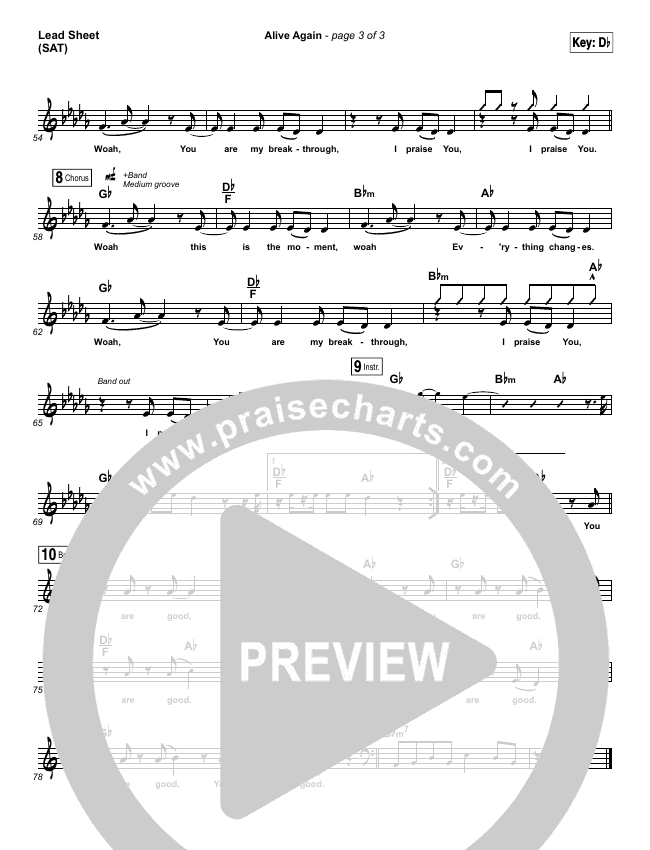 Download the sheet music for Alive Again by Planetshakers, from the album Legacy - Part 1: Alive Again. This song was arranged by Dustin Loehrs / Daniel Galbraith in the key of C, Db.