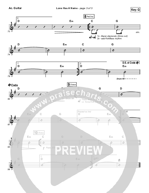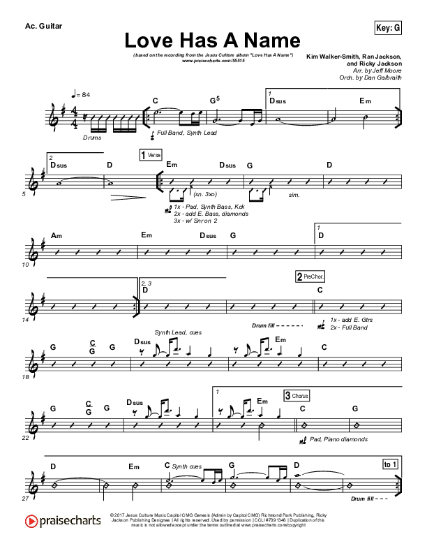 Download the Acoustic Guitar sheet music for Love Has A Name by Jesus Culture / Kim Walker-Smith, from the album Love Has A Name. This song was arranged by Jeff Moore / Daniel Galbraith in the key of Ab, G.