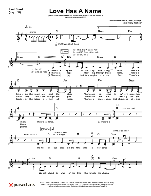 Download the sheet music for Love Has A Name by Jesus Culture / Kim Walker-Smith, from the album Love Has A Name. This song was arranged by Jeff Moore / Daniel Galbraith in the key of Ab, G.