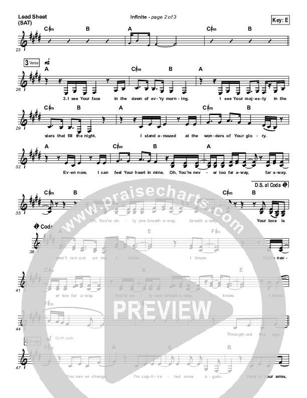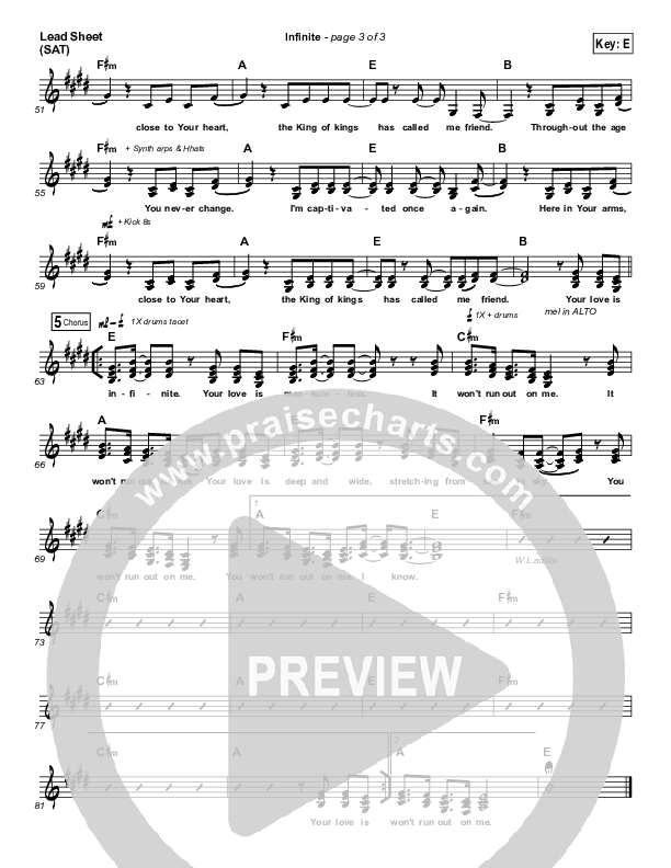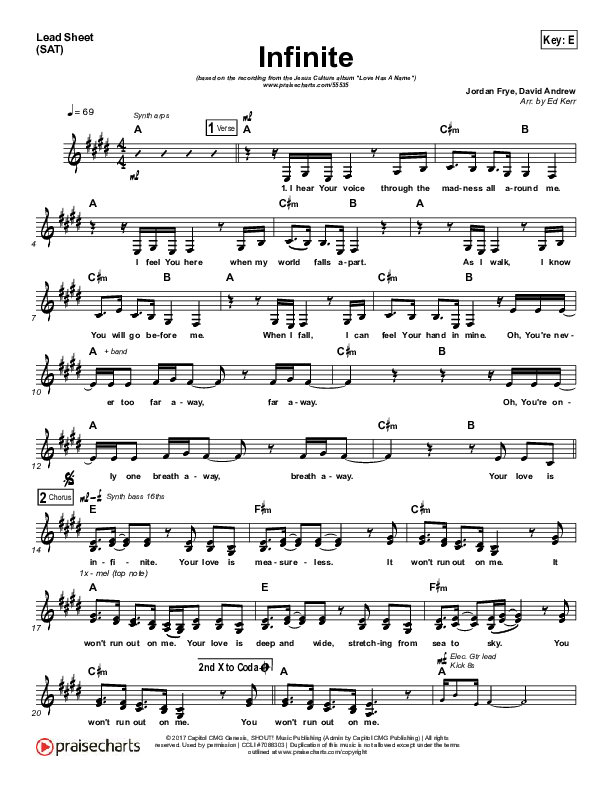 Download the sheet music for Infinite by Jesus Culture / Kim Walker-Smith, from the album Love Has A Name. This song was arranged by Ed Kerr in the key of E, F.