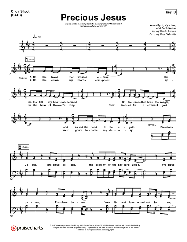 Download the Choir Sheet for Precious Jesus by GATEWAY, from the album Monuments. This song was arranged by Dustin Loehrs / Daniel Galbraith in the key of D, Eb.