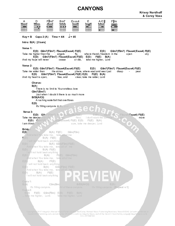 Download the PDF Chord Charts for Canyons by Corey Voss, from the album Songs Of Heaven And Earth. This song was arranged by Integrity Music in the key of B.