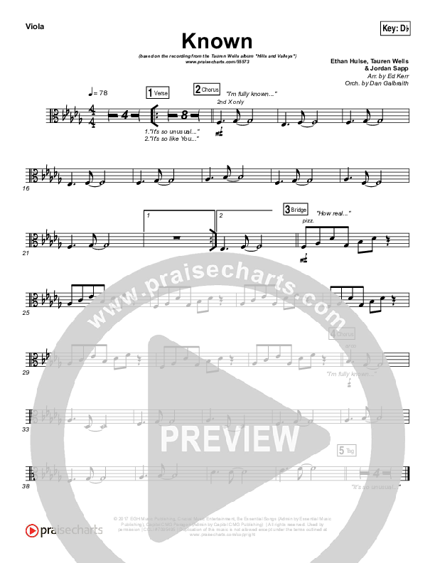 Download the Viola sheet music for Known by Tauren Wells, from the album Hills And Valleys. This song was arranged by Ed Kerr / Daniel Galbraith in the key of B, Bb, C, Db.