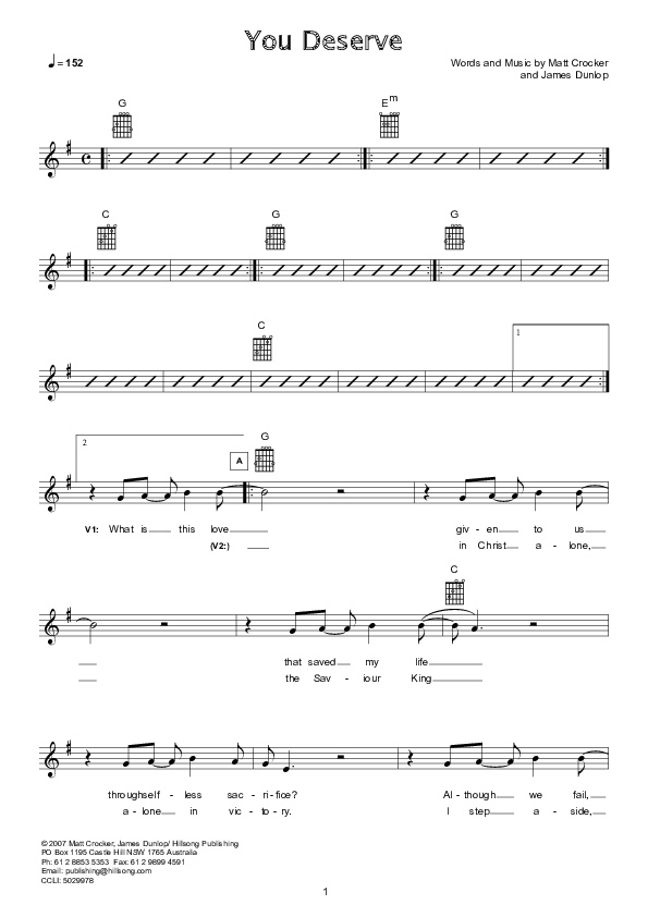 Download the sheet music for You Deserve by Hillsong London / Hillsong Worship, from the album Hail To The King. This song was arranged by Hillsong Music in the key of G.