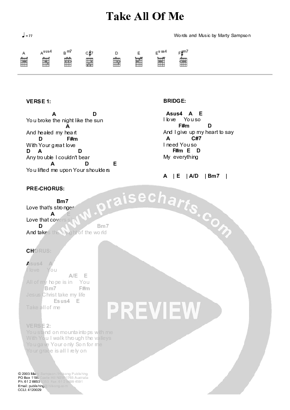 Download the PDF Chord Charts for Take All Of Me by Hillsong Worship, from the album I Heart Revolution. This song was arranged by Hillsong Music in the key of A.