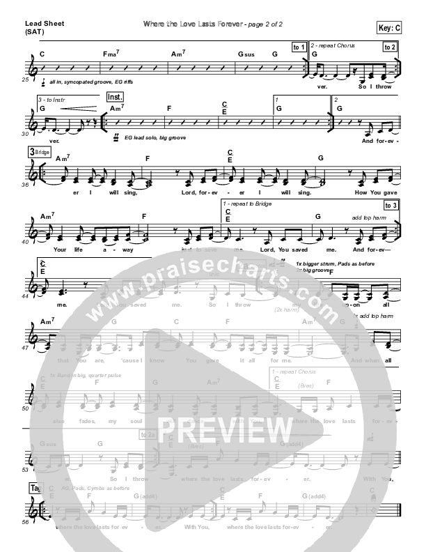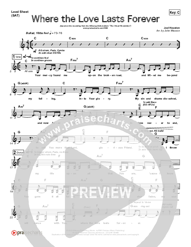 Download the sheet music for Where The Love Lasts Forever by Hillsong Worship, from the album I Heart Revolution. This song was arranged by John Wasson in the key of D.