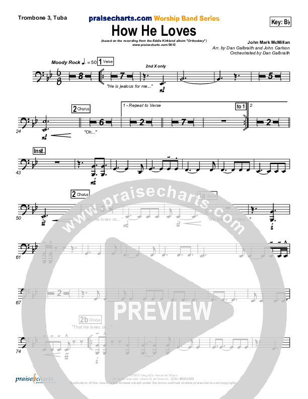 Download the Trombone 3/Tuba sheet music for How He Loves by Eddie Kirkland, from the album Orthodoxy. This song was arranged by Daniel Galbraith in the key of Bb, C.