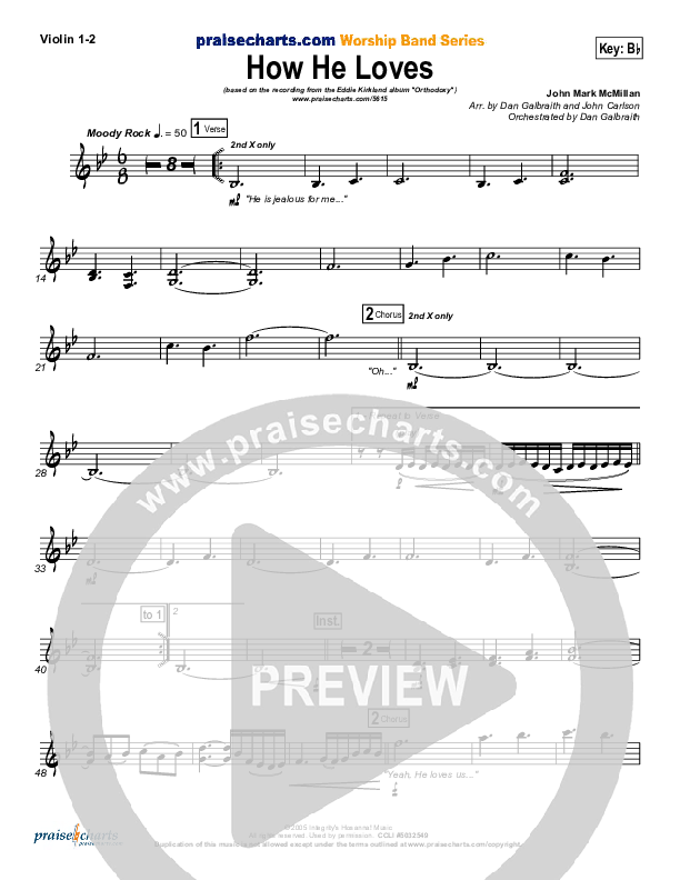 Download the Violin sheet music for How He Loves by Eddie Kirkland, from the album Orthodoxy. This song was arranged by Daniel Galbraith in the key of Bb, C.