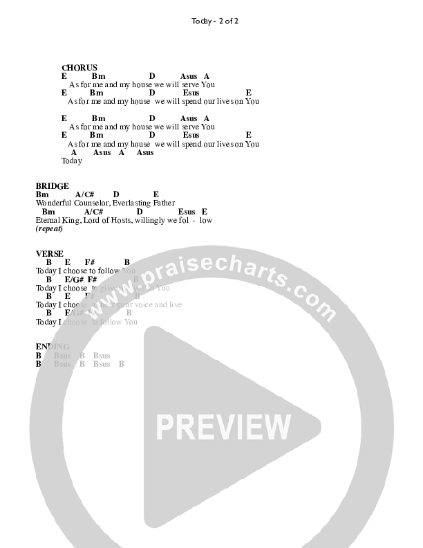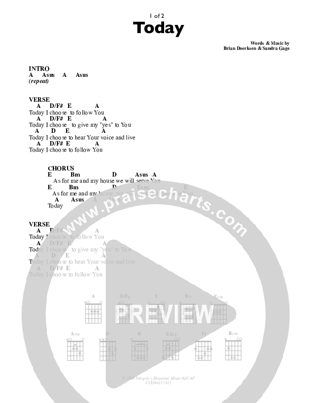 Download the PDF Chord Charts for Today by Brian Doerksen, from the album It's Time. This song was arranged by Integrity Music in the key of A.