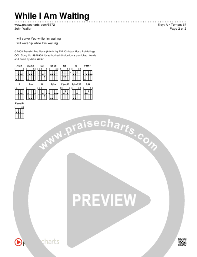 Download the PDF Chord Charts for While I Am Waiting by John Waller, from the album The Blessing. This song was arranged by Daniel Galbraith / John Carlson in the key of Bb, C.