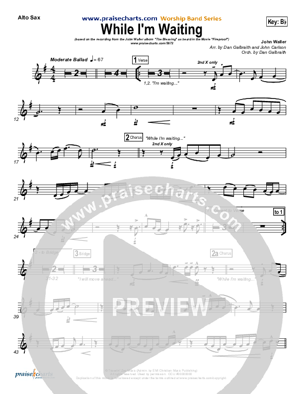 Download the AltoSax sheet music for While I Am Waiting by John Waller, from the album The Blessing. This song was arranged by Daniel Galbraith / John Carlson in the key of Bb, C.