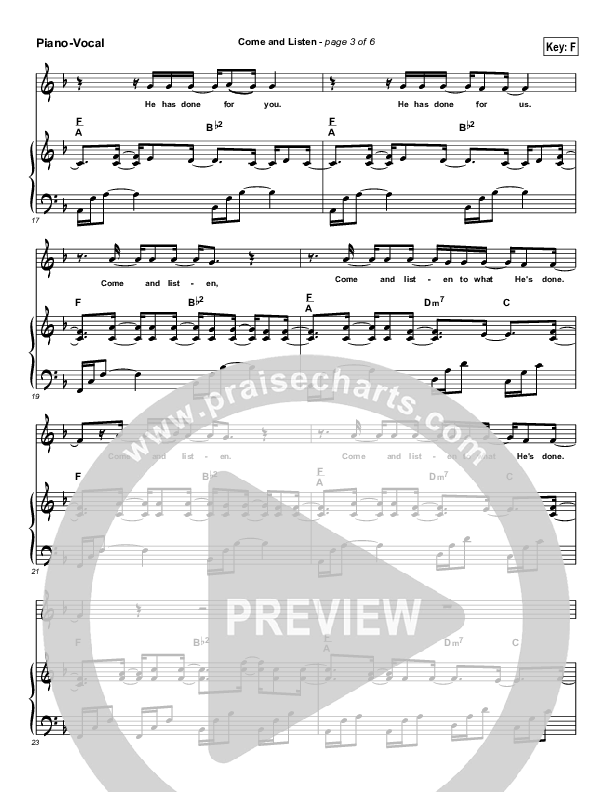Download the sheet music for Come And Listen by David Crowder, from the album North Point Live. This song was arranged by Grant Wall in the key of F, G.