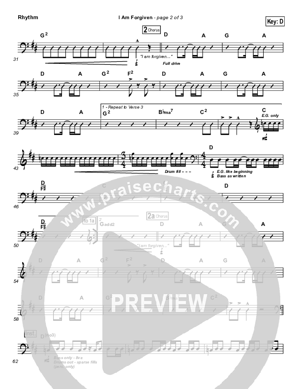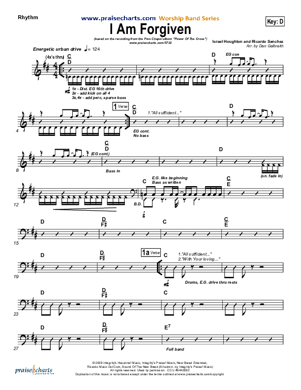 Download the Rhythm Chart for I Am Forgiven by Free Chapel, from the album Power Of The Cross. This song was arranged by Daniel Galbraith in the key of C, D.