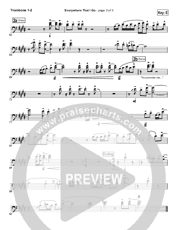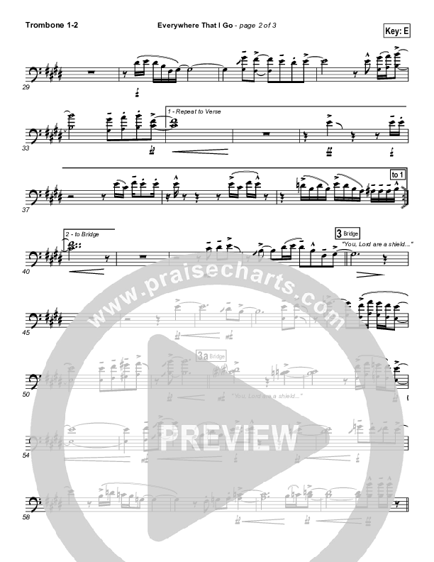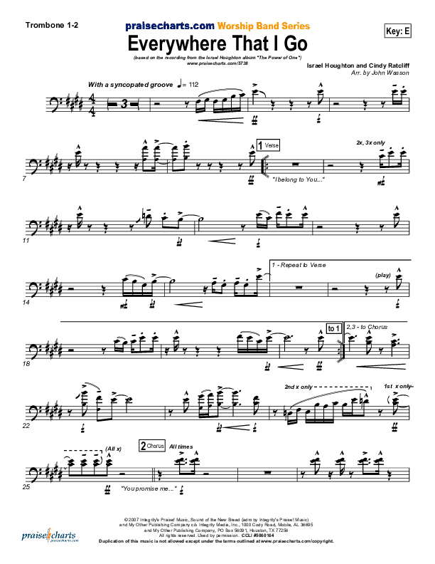 Download the Trombone 1,2 sheet music for Everywhere That I Go by Israel Houghton, from the album The Power of One. This song was arranged by John Wasson in the key of E, F.