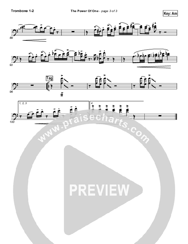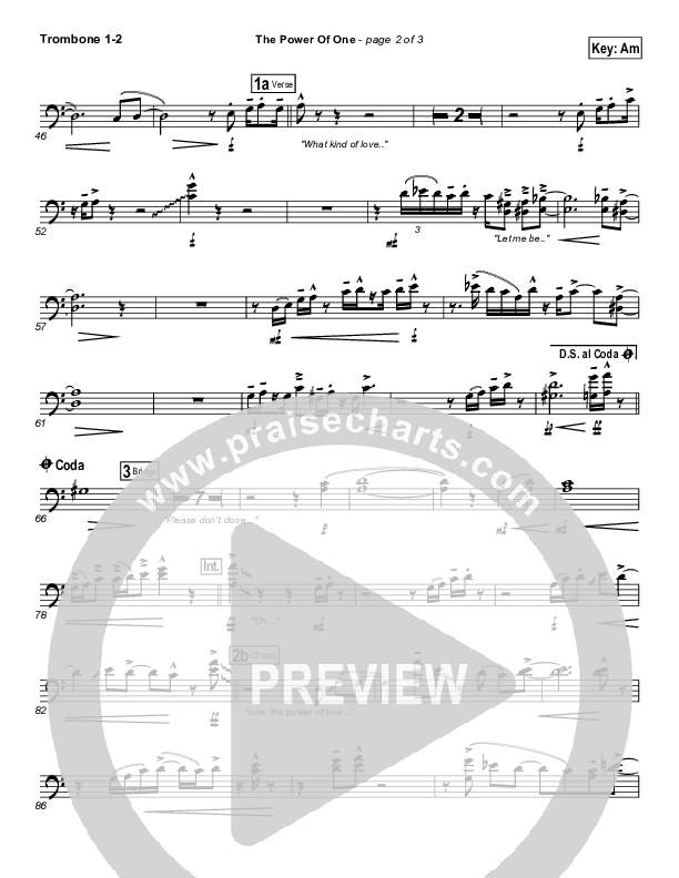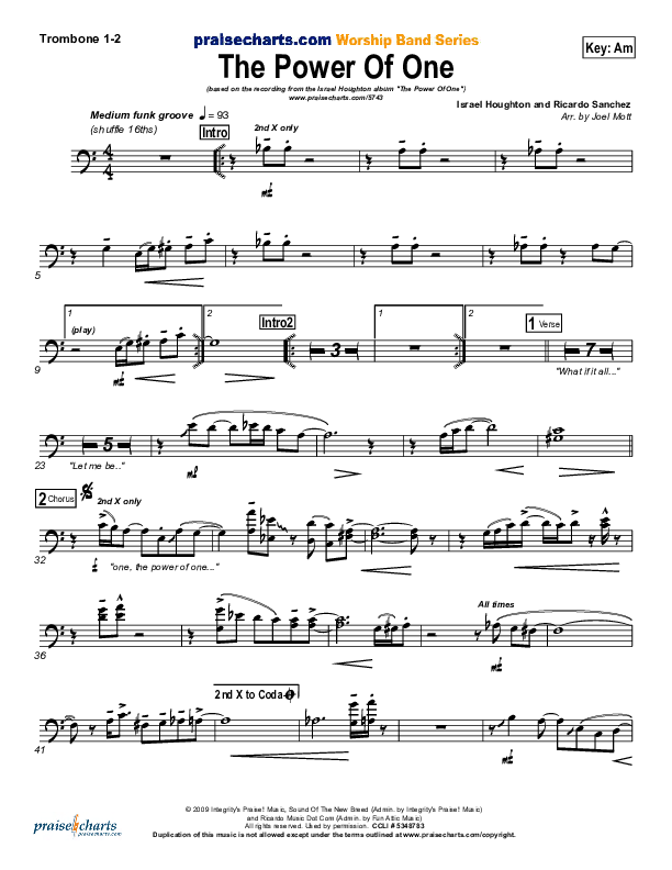 Download the Trombone 1,2 sheet music for The Power of One by Israel Houghton, from the album The Power of One. This song was arranged by Joel Mott in the key of Am, Gm.