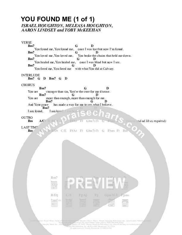 Download the PDF Chord Charts for You Found Me by Israel Houghton, from the album The Power of One. This song was arranged by Integrity Music in the key of D.