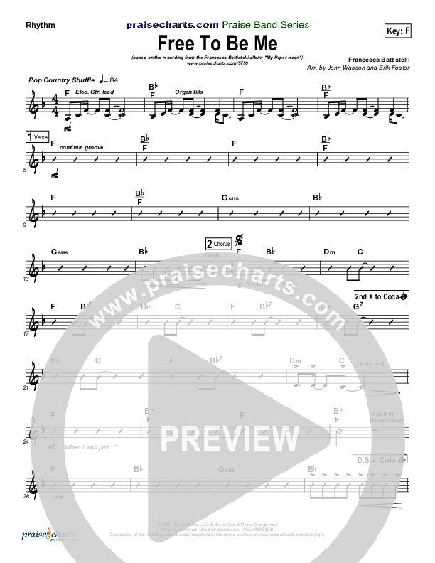 Download the Rhythm Chart for Free To Be Me by Francesca Battistelli, from the album My Paper Heart. This song was arranged by John Wasson / Erik Foster in the key of F, G.
