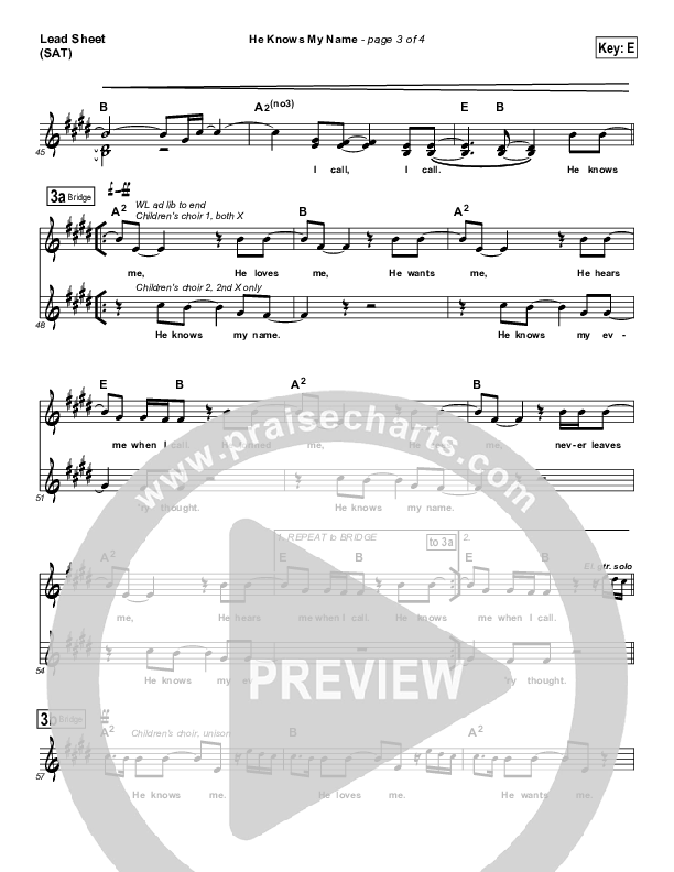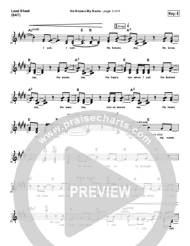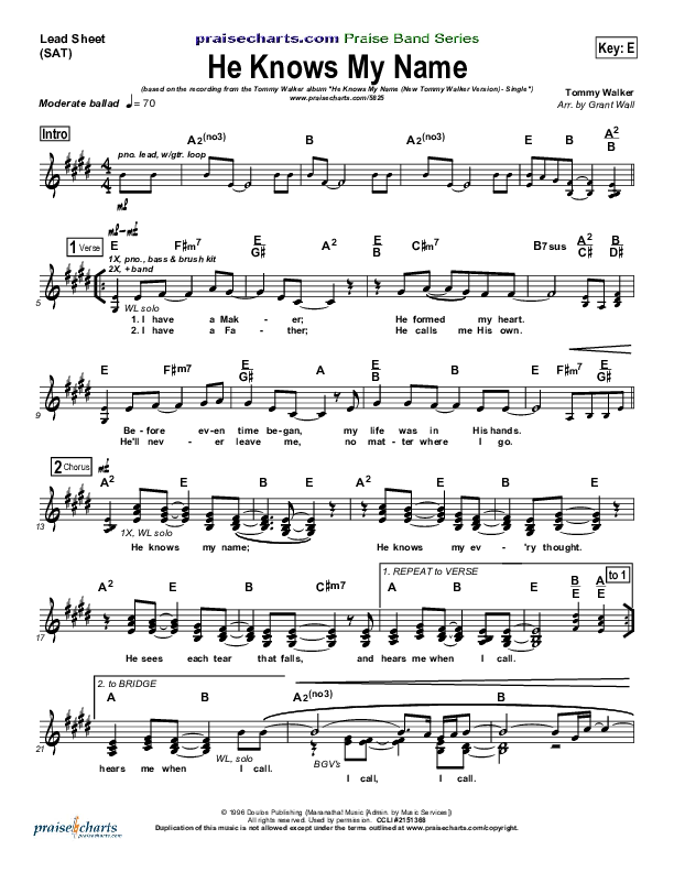 Download the sheet music for He Knows My Name (New Version) by Tommy Walker, from the album He Knows My Name (New Version) - Single. This song was arranged by Grant Wall in the key of E, F.