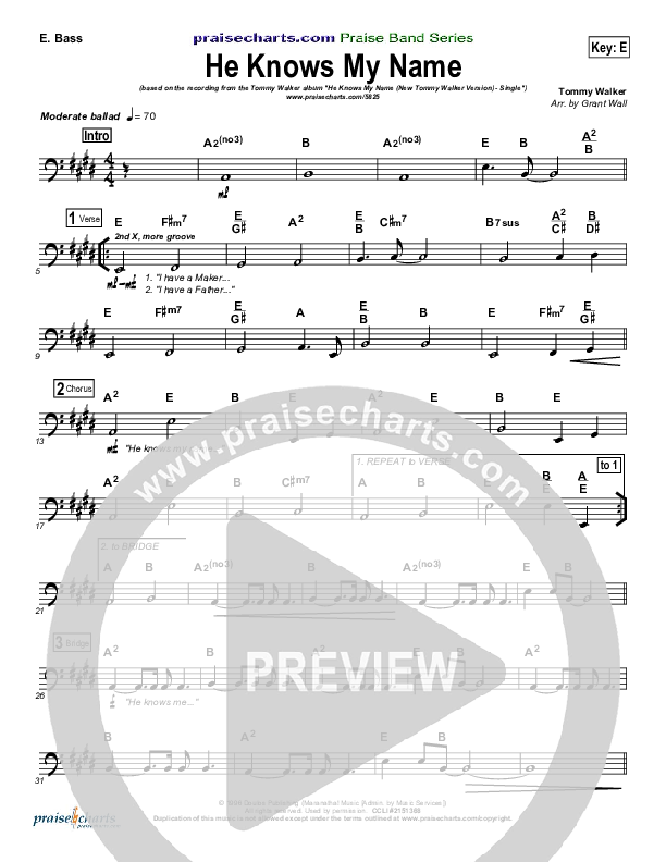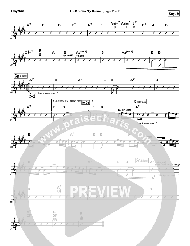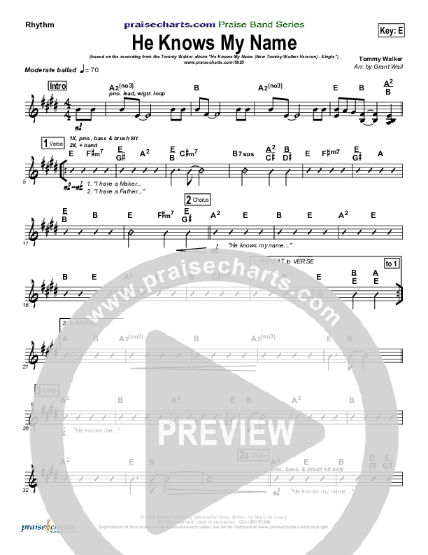 Download the Rhythm Chart for He Knows My Name (New Version) by Tommy Walker, from the album He Knows My Name (New Version) - Single. This song was arranged by Grant Wall in the key of E, F.