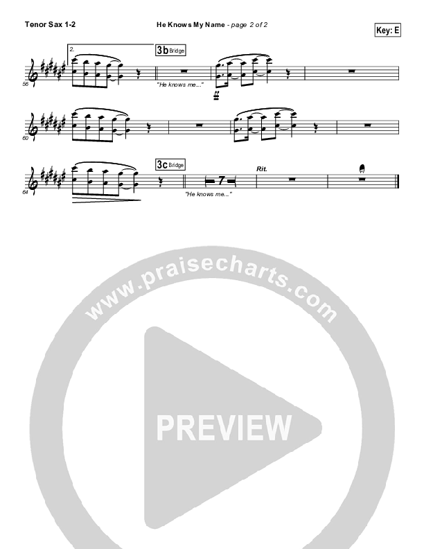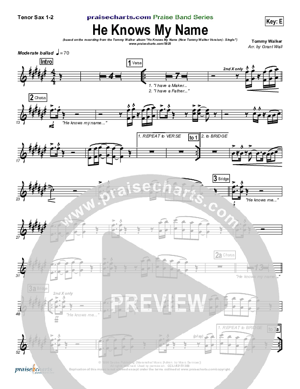 Download the Tenor Sax sheet music for He Knows My Name (New Version) by Tommy Walker, from the album He Knows My Name (New Version) - Single. This song was arranged by Grant Wall in the key of E, F.