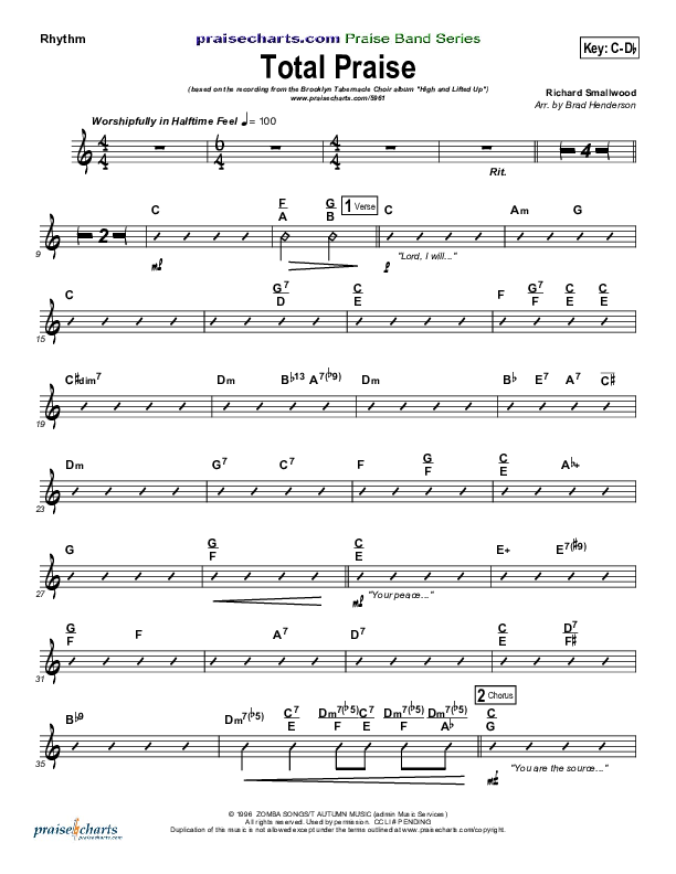 Download the Rhythm Chart for Total Praise by Songs of Brooklyn Tabernacle Choir (PraiseCharts Edition), from the album Songs Of Brooklyn Tabernacle Choir. This song was arranged by Brad Henderson in the key of Bb, C.
