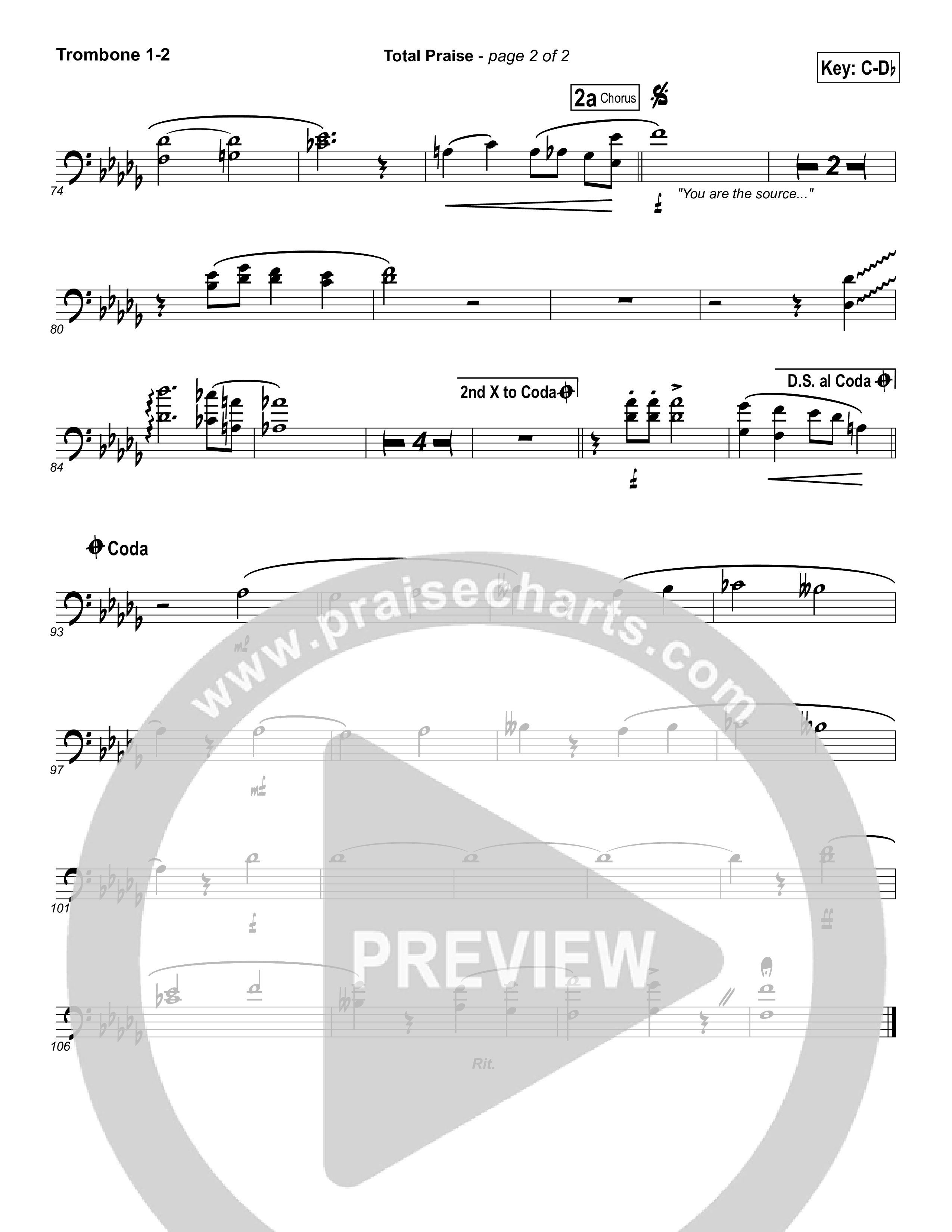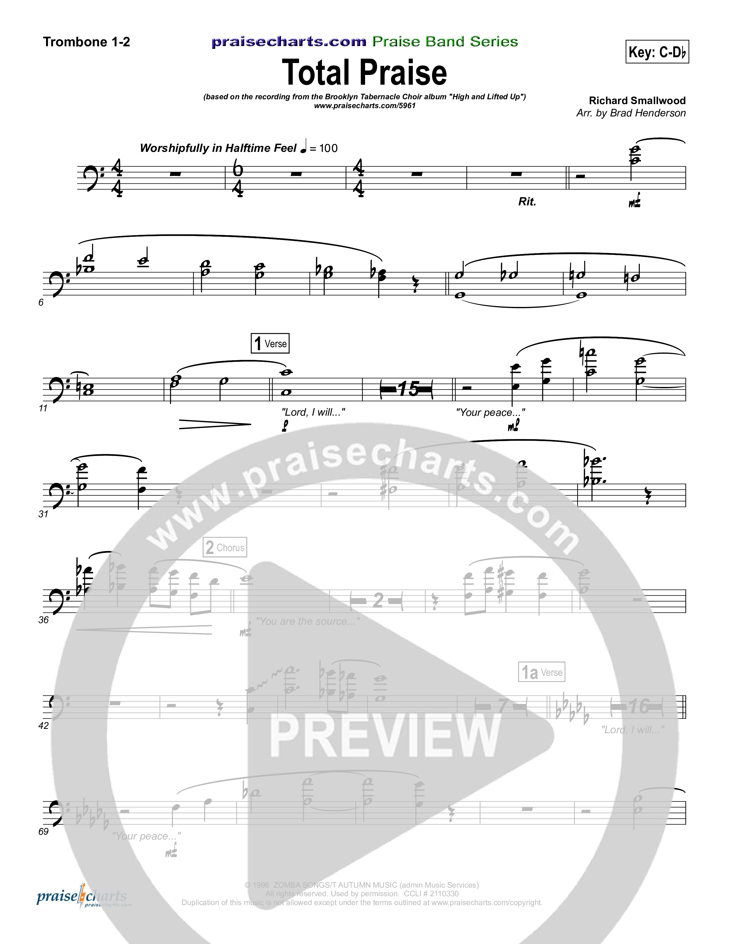 Download the Trombone 1,2 sheet music for Total Praise by Songs of Brooklyn Tabernacle Choir (PraiseCharts Edition), from the album Songs Of Brooklyn Tabernacle Choir. This song was arranged by Brad Henderson in the key of Bb, C.