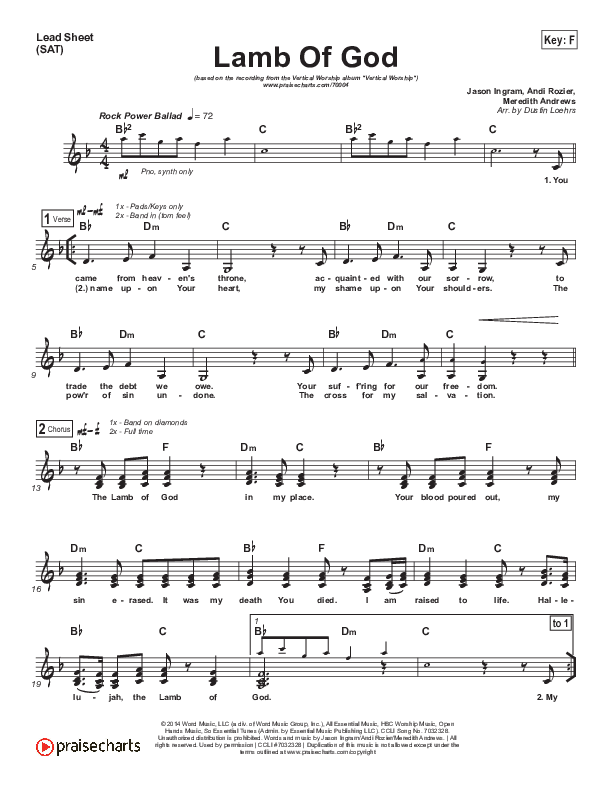 Download the sheet music for Lamb Of God by Vertical Worship, from the album Vertical Worship. This song was arranged by Dustin Loehrs in the key of F, G.