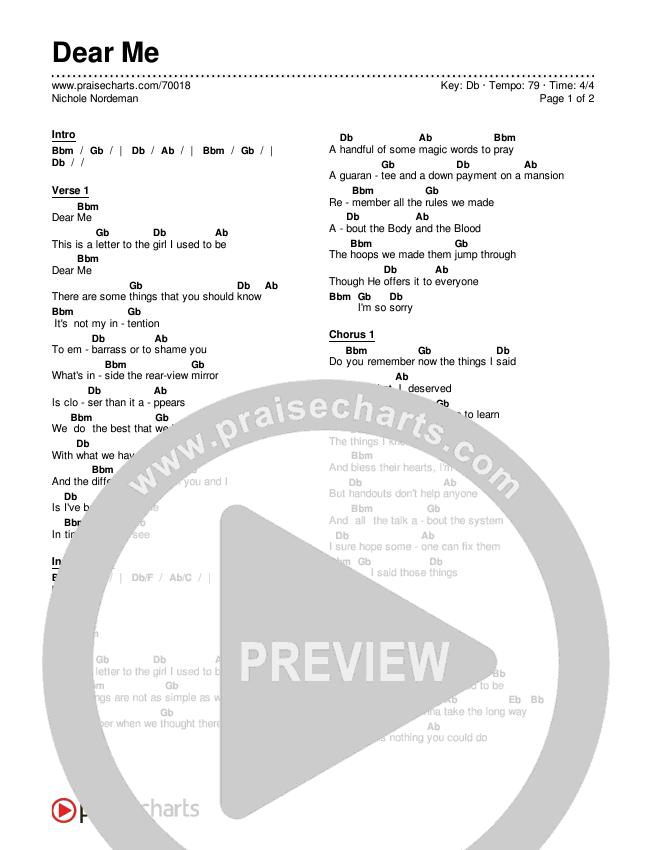 Download the PDF Chord Charts for Dear Me by Nichole Nordeman, from the album Every Mile Mattered. This song was arranged by Ed Kerr in the key of D, Db.