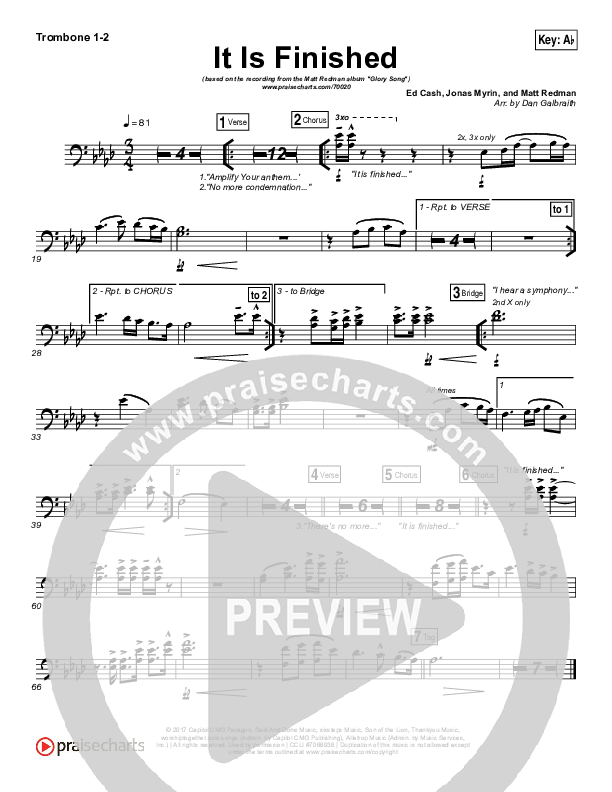Download the Trombone 1,2 sheet music for It Is Finished by Matt Redman, from the album Glory Song. This song was arranged by Daniel Galbraith in the key of Ab, G.