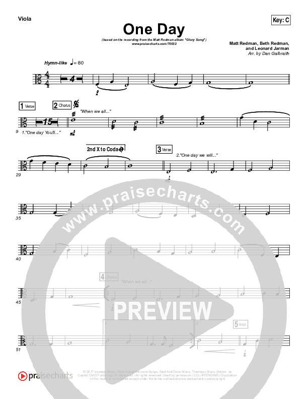 Download the Viola sheet music for One Day (When We All Get To Heaven) by Matt Redman, from the album Glory Song. This song was arranged by Daniel Galbraith in the key of Bb, C.