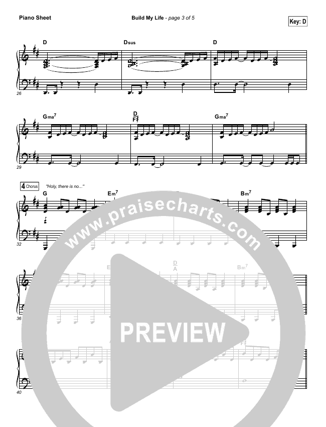 Download the piano sheet for Build My Life by Christy Nockels, from the album Build My Life. This song was arranged by Daniel Galbraith in the key of D, Eb.