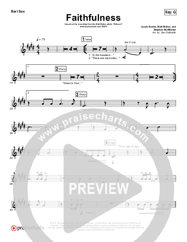 Download the Bari Sax sheet music for Faithfulness by Matt Maher / Iron Bell Music, from the album Echoes. This song was arranged by Daniel Galbraith in the key of F, G.